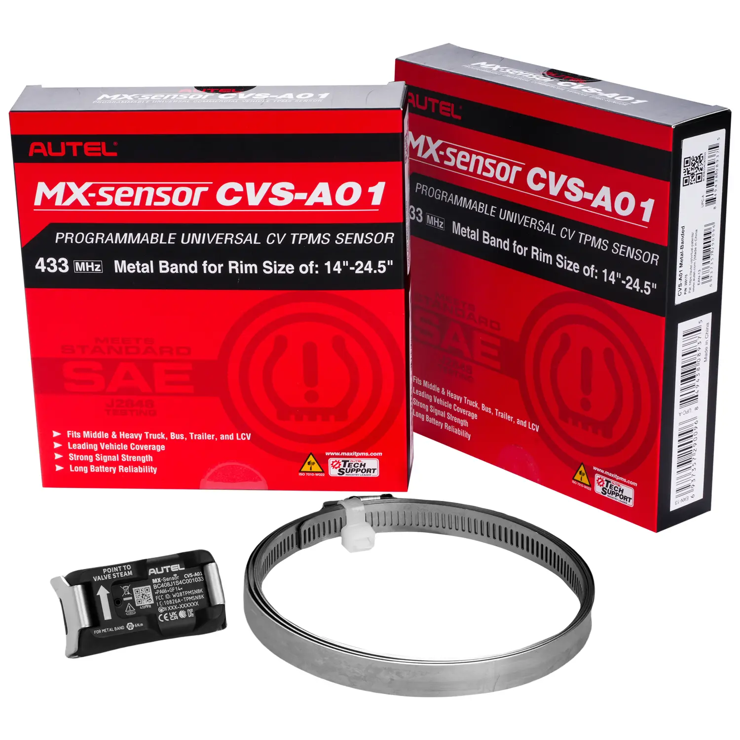The Autel MX-Sensor CVS-A01 (PN 300170) is a universal, programmable TPMS sensor for commercial vehicles. Designed for 433MHz systems, it mounts to 14–24.5” rims using a metal band. Compatible with the Autel ITS600CV, it replaces OE and aftermarket sensors on trucks, trailers, and buses. Built for durability, strong signal performance, and long battery life, it meets or exceeds industry standards for commercial TPMS applications.