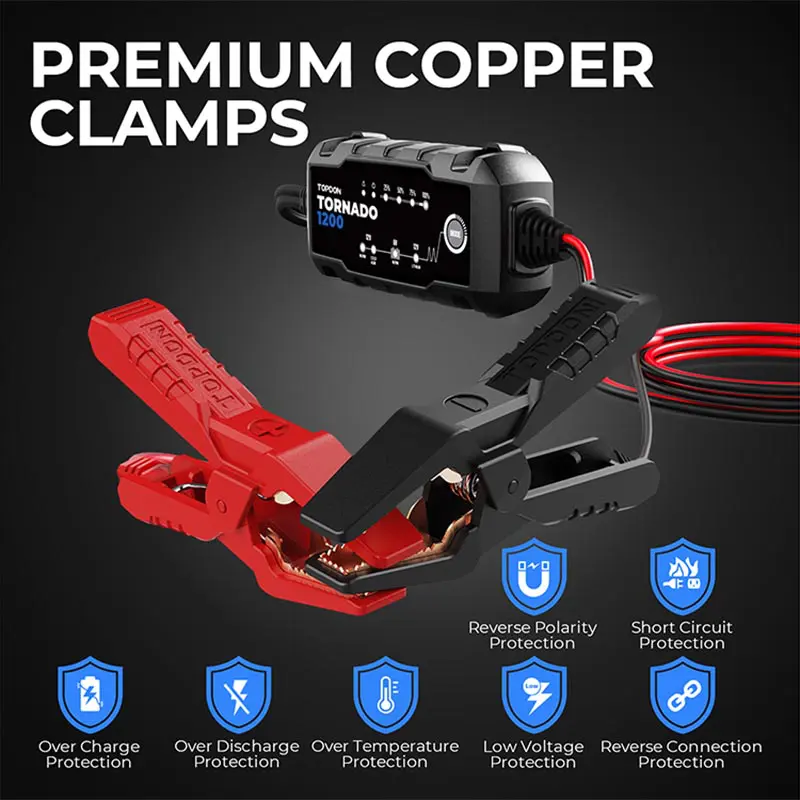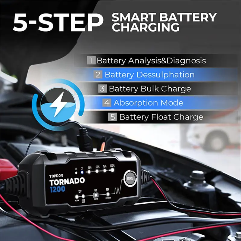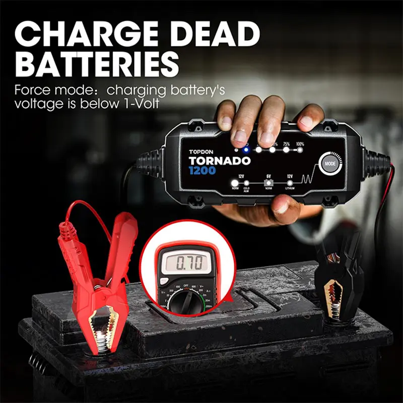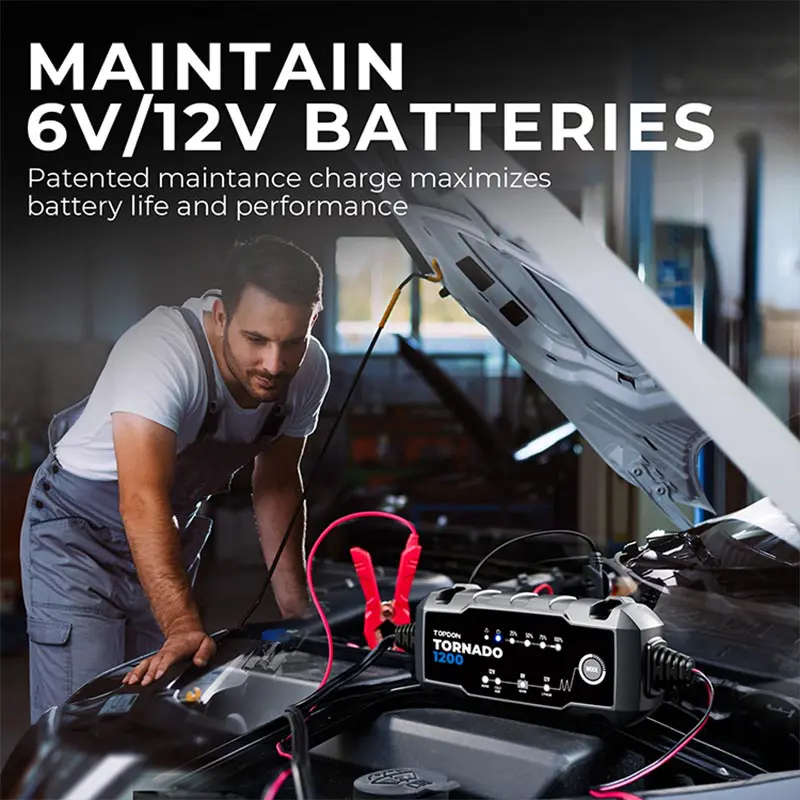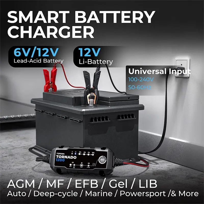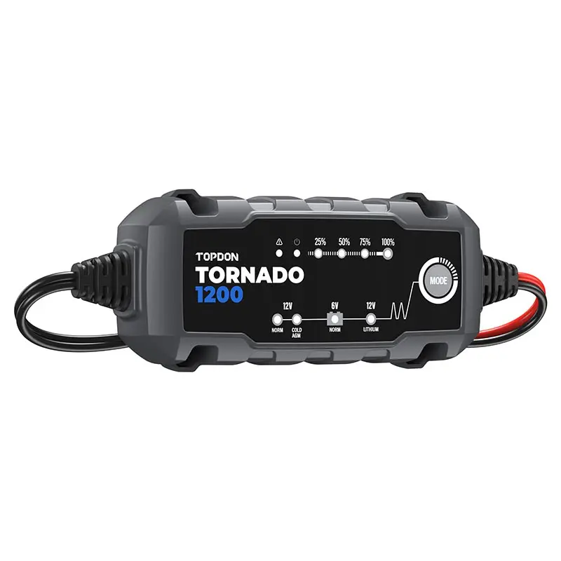 The Tornado1200 is a 6V & 12V smart battery charger for Lead-Acid and Lithium-Ion batteries. It functions as a battery maintainer, trickle charger, and desulfator. Ideal for cars, motorcycles, boats, and power equipment, it offers multi-step charging, cold-weather performance, and a rugged, water-resistant design. Extend battery life and save money with this durable, all-in-one charging solution.