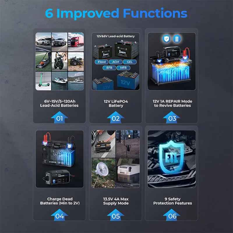 The Tornado4000 supports a wide selection of batteries ranging from 5Ah to 120Ah, compatible with all types of 6V & 12V lead-acid batteries, and 12V lithium batteries including LI, AGM, WET, GEL, MF, CAL, EFB.