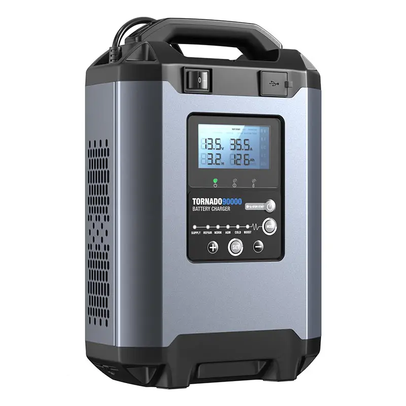 The Tornado90000 is a professional-grade smart charger built for 12V & 24V lead-acid and lithium batteries, supporting capacities from 5 to 90Ah. With 9-step smart charging, 6 charging modes, and an adjustable current/voltage edit function, it ensures battery safety and performance. Use SUPPLY Mode for stable DC output, ideal for programming voltage stabilization in automotive and workshop settings.
