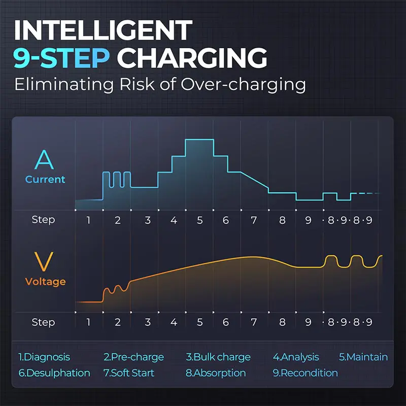 • 9-Step Smart Charging enhances battery health and prevents overcharging